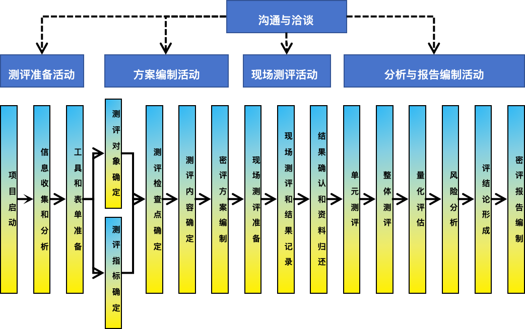 商用密码应用安全性评估为信息系统的密码应用建设提供工作建议,从而确保了信息系统的密码应用在各个方面都能符合要求,保障了信息系统的安全性。商用密码应用安全性评估的过程分为四项基本测评活动:测评准备、方案编制、现场测评、分析与报告编制。流程如下图所示: